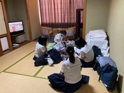 予定通り、宿舎となる久米川温泉に到着しました。早速TVやトランプで少し休憩しています。