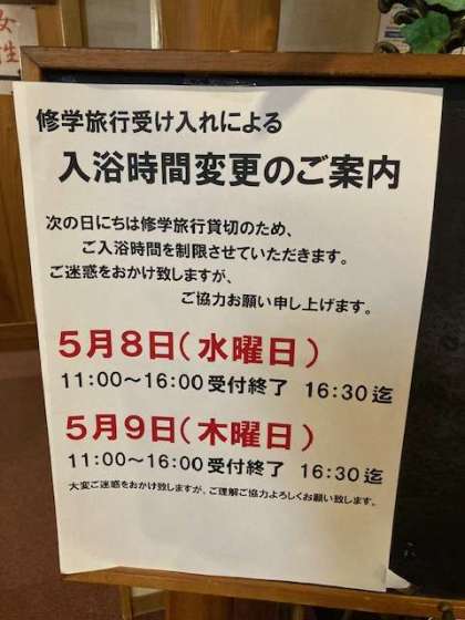 今日から3日間お世話になる久米川温泉さんの1Fロビーに上の写真の様な立て看がありました。普段の日帰り温泉の時間を制限して、我々が過ごし易いよう、配慮していただいている様です。本当に有難い事です。