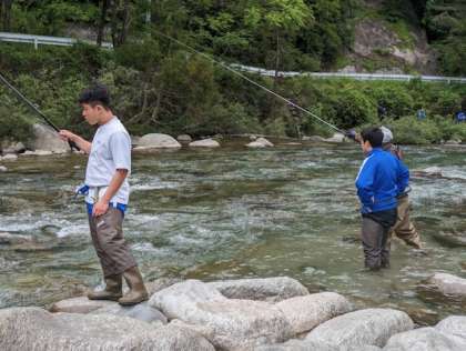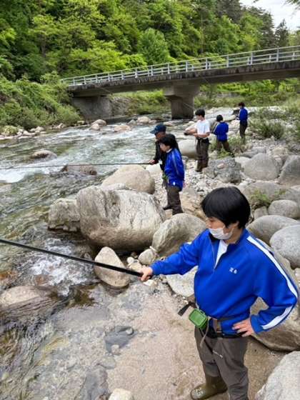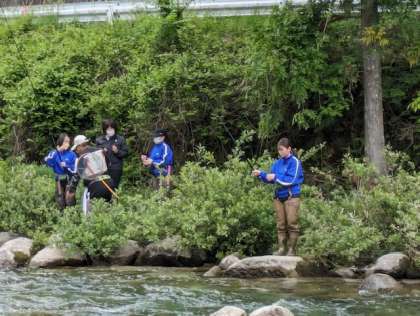 釣り班は、大自然の中、あまごを釣っています。釣れた魚はリリースします。