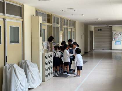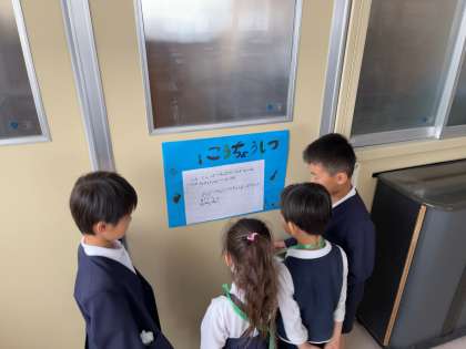 2年生の子どもたちが1年生の子どもたちを学校を案内し、1年生の子どもたちはそれぞれの部屋についてクイズをします。