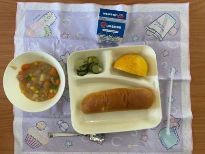 本日の献立は、おさつパン、鶏肉とコーンのシチュー、キャベツときゅうりのサラダ、かわちばんかん、牛乳です。