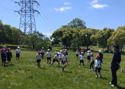 芝生の上でとても楽しそうに遊び、仲良く元気いっぱいに活動しています。