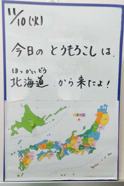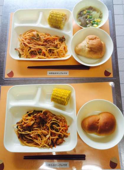 キノコのスパゲティはエリンギ、生シイタケ、シメジ、3種類のキノコが入っています。キノコが苦手な子どもたちにも食べやすいように、ケチャップ味でベーコンの風味も合わせて調理されています。