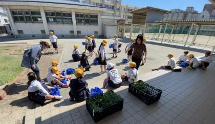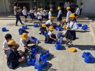 子どもたちは、プランターに土を入れたのち、自分が希望した野菜の苗をビニールポットから取り出してプランターに入れ、最後に土寄せをしました。