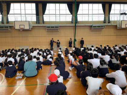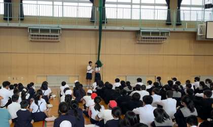 1年生から9年生までの全学年がそろっての初めての朝会です。