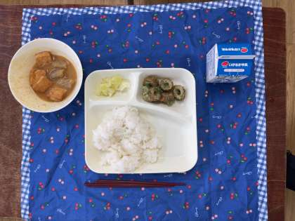本日の献立は、ごはん、ちくわのいそべあげ、あつあげとさといものみそ煮、あっさりキャベツ、牛乳です。
