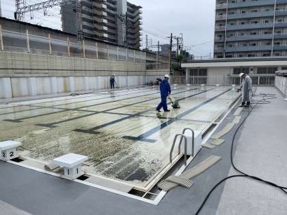 今日はプールサイド、排水溝、プールの底をきれいにしています。