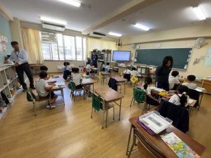 子どもたちは、先生が出した問題を時計の模型を使って自分の考えを確かめていました。