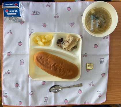 本日の献立は、コッペパン、バター、金時豆の中華おこわ、中華スープ、パインアップルの缶詰、牛乳です。