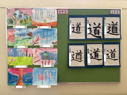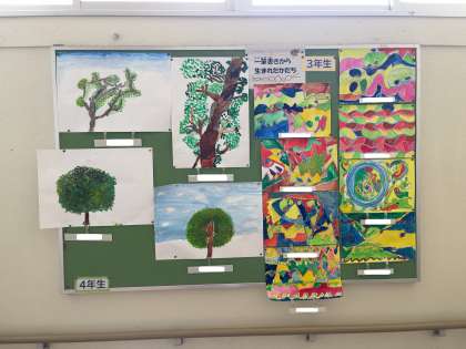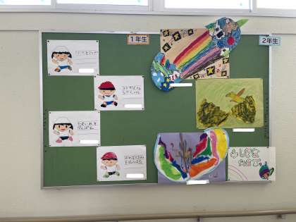 校内には、たくさんの掲示板があり、その中には子どもたちの作品を掲示するものもあります。