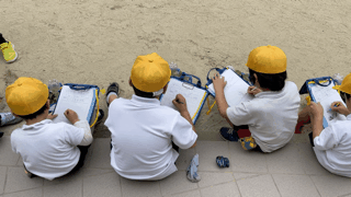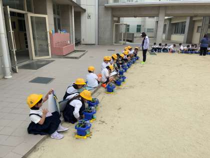 双葉の次に本葉が開き、子どもたちは葉っぱの形や色の違いを確かめながらスケッチしていました。本葉を触った子どもからは、表面がざらざらしてる、本葉には毛が生えていると感想を述べていました。