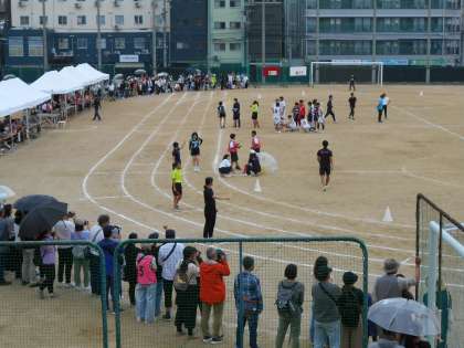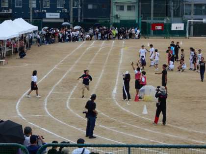 クラブ対抗リレーでは各クラブでチームを作り、男女に分かれて対抗リレーをしました。教職員からもチームを出し、生徒たちと一緒に走りました。白熱したレース展開でした。