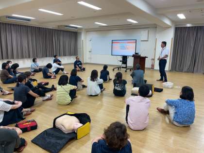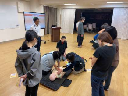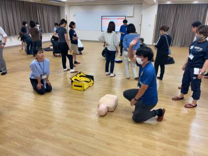 教職員のみなさんは、DVDを見たのち、心肺蘇生とAEDの使い方を実際に行いました。