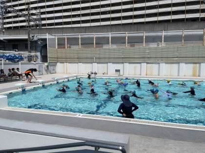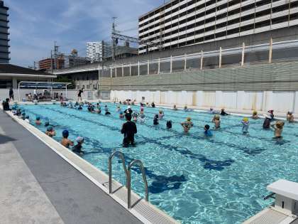 音楽に合わせて踊り、しっかりと水に慣れました。