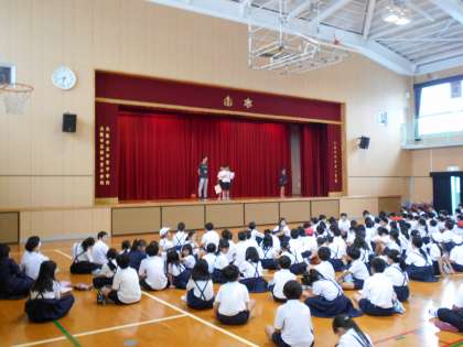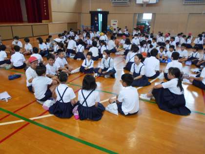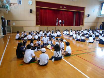 児童集会がありました。たてわり班で「ごろごろドカン」を行いました。集会委員会の説明で始まり、班で円になり、司会が「ゴロゴロゴロ・・・・」と言っている間、お隣にボールを回していきました。そして、司会が「ドカン!」といった時点でボールも持っている子がアウトになっていました。子どもたちはドキドキしながら、班の友だちとゲームを楽しんでいました。