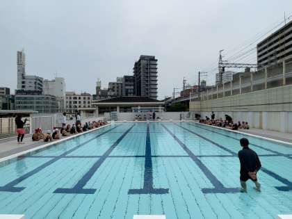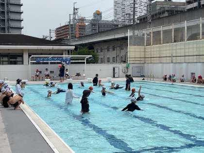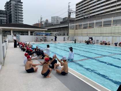 1・2年生で2・3人でバディーを組み、プールの短辺を端から端まで歩くなどの活動をしました。