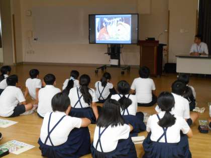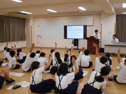 3時間目、6年生はゲストティーチャーを招いて租税教室を行いました。税金が社会の様々なところで、どのように役立っているのかを知ることができました。また、世界のめずらしい税金についてのお話では、日本の税金との違いに興味を持って聞くことができました。