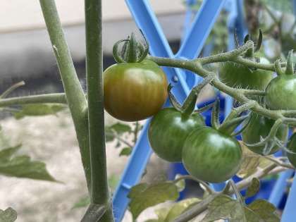今朝は、ご覧のようにミニトマトが色づいているのを見つけることができました。さらに、おくらの花も咲いているのを見つけることができました。