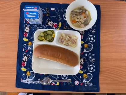 本日の献立は、黒糖パン、鶏肉とてぼ豆のスープ煮、ベーコンとじゃがいものチーズ焼き、きゅうりとコーンのサラダ、牛乳です。
