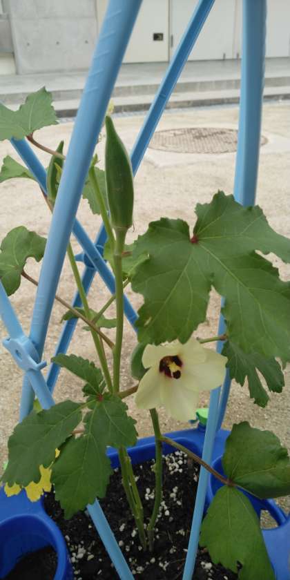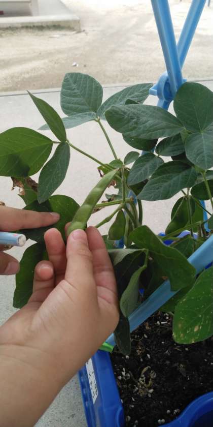 オクラ、ピーマン、枝豆が育ってきました。子どもたちがその様子を観察しています。
