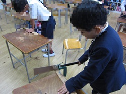 まずはじめに、子どもたちにのこぎりの使い方を指導しました「刃が引っかかって、切りにくいな。」。「切りやすい刃と切りにくい刃があるぞ。」と言っていた子どもたちも、木目を気にしたり、引くときだけに力を入れたり、刃を引く時の角度を注意したりすることで、のこぎりの上手な使い方が分かりました。