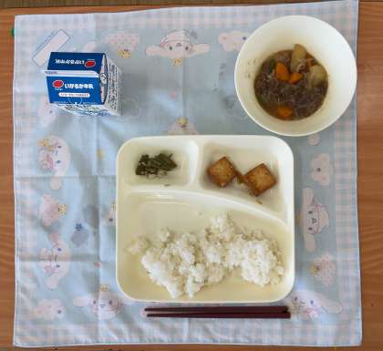 本日の献立は、ごはん、肉じゃが、あつあげのみそだれかけ、オクラのおかかいため、牛乳です。