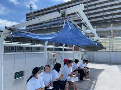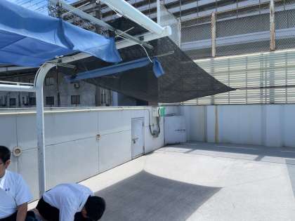 本日、遮光シートを付けて見学者が座っているところは日陰になるようにしました。