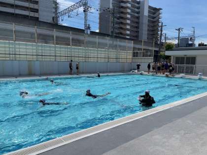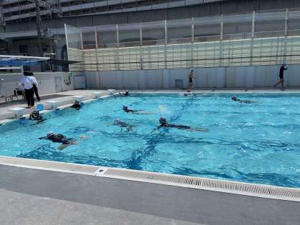 子どもたちは、「水がとても気持ちいい」、「平泳ぎの足の動きが難しい」と言いながら、バタフライや自由形、平泳ぎで泳いでいました。