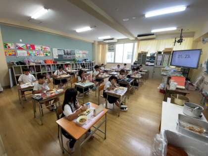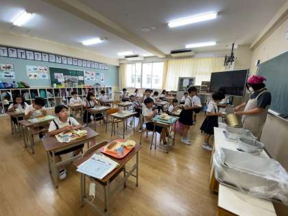 鶏肉のからあげは、子どもたちに人気のメニューの一つです。3年生の子どもたちは、特にからあげのおかわりにたくさん並んでいました。また、どのメニューもおいしそうに食べていました。
