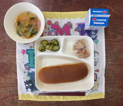 本日の献立は、黒糖パン、鶏肉のからあげ、ハムとはるさめのスープ、きゅうりの中華あえ、牛乳です。