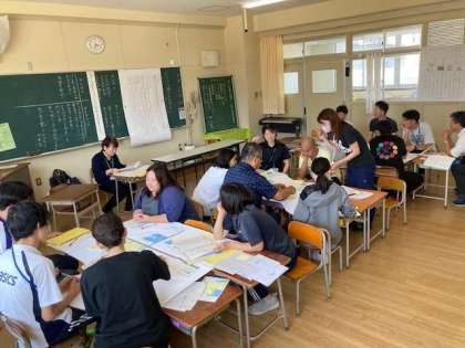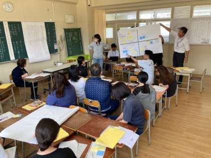 児童が下校した後は、今日の授業をうけて小学校教員研修が行われました。発問の仕方や内容等をグループに分かれて討議しました。