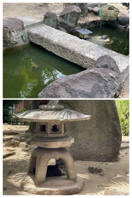 この日は、とても暑かったので、猫が灯篭の陰でゆったりとしていました。