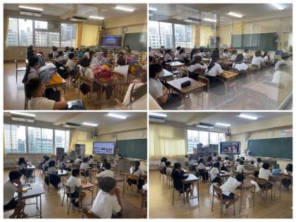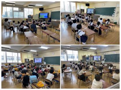 1〜3年生は総務省が作成・発行している、地震や津波をテーマにしたクイズと、「安全に登下校するために」「防災訓練の心構え」に関する動画を見ました。