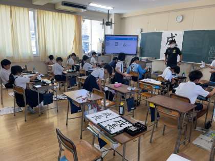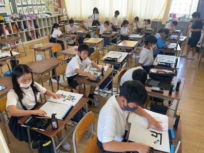 子どもたちは、「書道は苦手」「筆が思うように動きません」といいながらも、心を落ち着けながら書いていました。