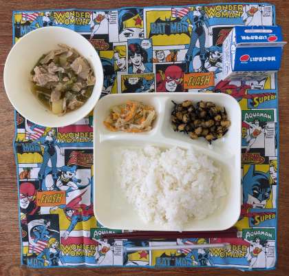 本日の献立は、ごはん、豚肉とじゃがいもの煮もの、ひじき豆、ささみと野菜のごまみそ焼き、牛乳です。