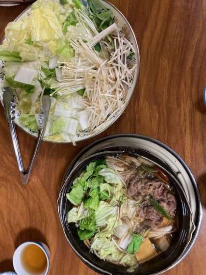 川遊びで思いっきり遊び、入浴を済ませた後はお楽しみの夕食です。献立はすき焼きです。
