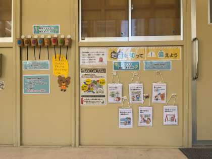 小学校保健室の前に「地震を知って備えよう」と、子どもたちがわかりやすいように掲示物を作成し注意を呼び掛けています。