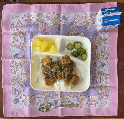 本日の献立は、マーボーあつあげ丼、あっさりきゅうり、りんごの缶詰、牛乳です。