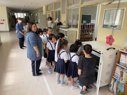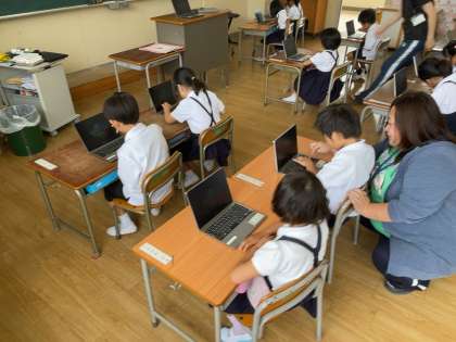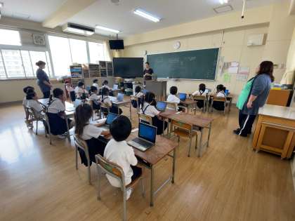 1年生の子どもたちは初めて使います。学習者用端末にログインするために、ユーザIDとパスワードを入力しました。キーボードが初めてなので、どこにどの文字があるかを探しながら入力していました。入力が終わり、ログインできると、子どもたちは「できたー」と喜んでいました。