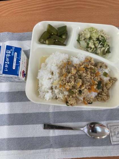 本日の献立は、他人丼、ささみと野菜の炒めもの、オクラの甘酢あえ、牛乳です。。