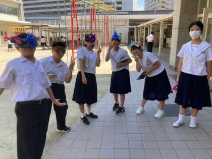 なりたい自分をイメージして仮面?マスク?を作成し、それを付けて班ごとに撮影をしました。