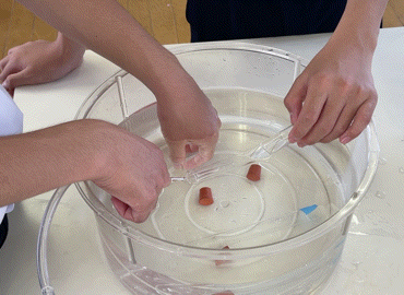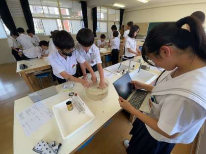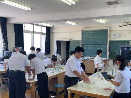 初めに、石灰石と塩酸を混ぜて気体を発生させ、発生した気体を水上置換法で集めました。子どもたちは、班員で協力して気体を集めたり、実験を学習者用端末を使って動画で記録しました。