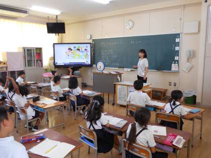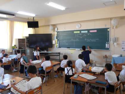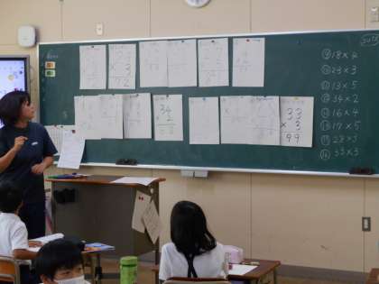 1年生は時計の学習に取り組んでいました。長いはりと短いはりの位置を見て、時計の読み方について学んでいました。2年生はかさの学習に取り組んでいました。実際に水を容器に入れ、かさを量ることができました。3年生は繰り上がりのあるかけ算を学習していました。繰り上がる仕組みについて学ぶことができました。