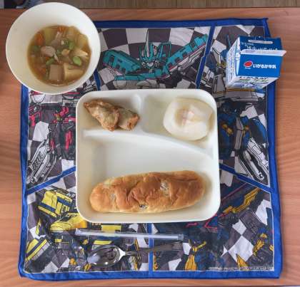本日の献立は、おさつパン、あげぎょうざ、鶏肉ととうがんの中華煮、なし(豊水)、牛乳です。中学生は、なし(豊水)の代わりに和なしの缶詰が付きます。