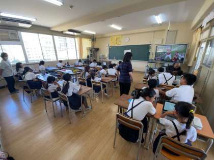 オンライン会議に参加した子どもたちは、自分や友達の顔が画面に映ったのを見て、学習者用端末のカメラ向かって手を振ったりしながら、みんなで嬉しそうに練習をしました。