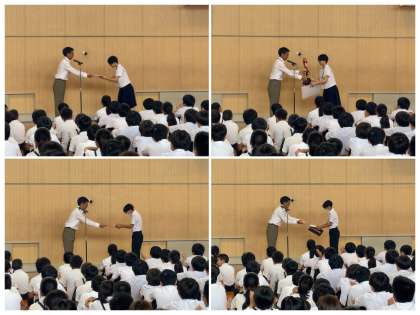 最初に空手の日本チャンピオン、水泳の日本2位というすごいレベルでの表彰式が行われました。パリオリンピック・パラリンピックが終わったばかりですが、今日の2人は本校児童生徒に世界を感じさせてくれました。今後も努力を重ねてくださいね。