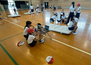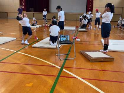 子どもたちは、自分の動作を確認し、友達や先生にアドバイスをもらいながら練習していました。