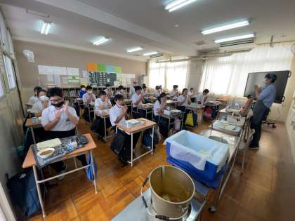 8年生の子どもたちはどのメニューもおいしそうに食べていました。特にチキンカレーライスが大人気で、おかわりをたくさんしていました。