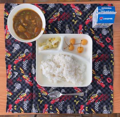 本日の献立は、チキンカレーライス、キャベツとコーンのサラダ、さくらんぼの缶詰、牛乳です。