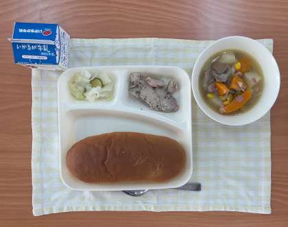 本日の献立は、黒糖パン、鶏肉のバジル焼き、ベーコンと野菜のスープ煮、キャベツときゅうりのサラダ、牛乳です。